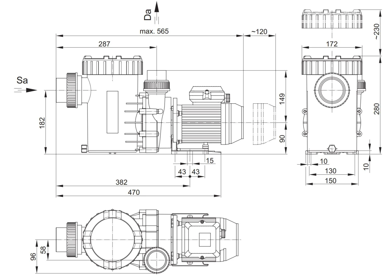 Schwimmbadwasser-Umwälzung in Filteranlagen, aufstellbar max. 0,5 m oberhalb des Wasserniveaus.