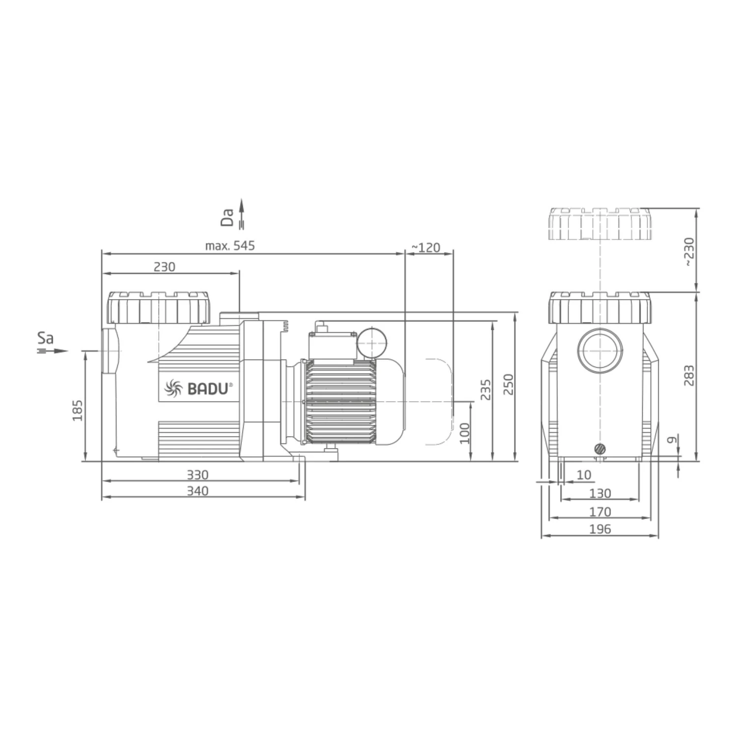 Schwimmbadwasser-Umwälzung in Filteranlagen, aufstellbar jeweils max. 3 m oberhalb oder unterhalb des Wasserniveaus.