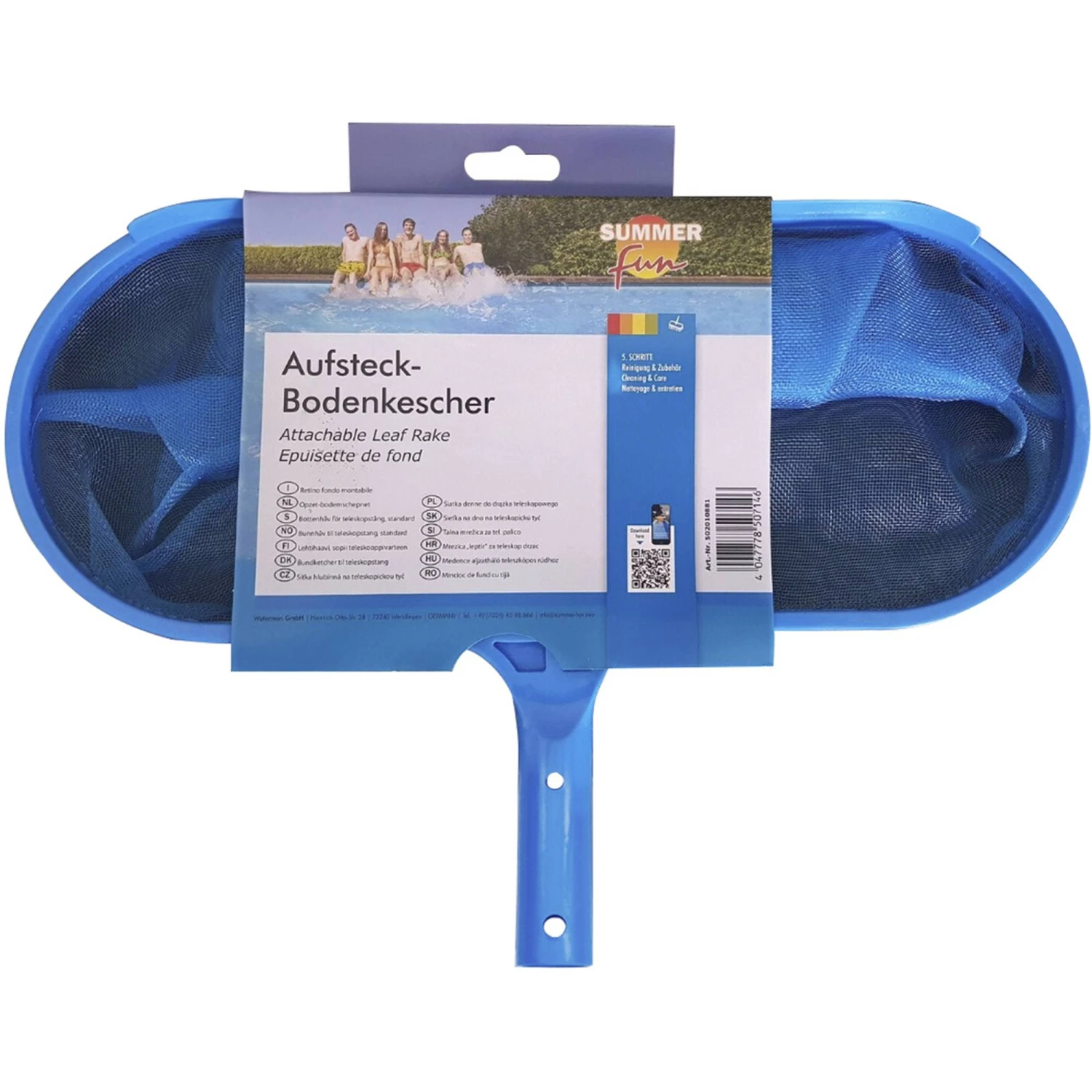Der Aufsteck-Bodenkescher mit verstärktem Rahmen von der Marke SummerFun nimmt abgesunkene Schmutzpartikel vom Boden auf. Passend mit allen handelsüblichen Teleskopstangen mit 32 mm Durchmesser.