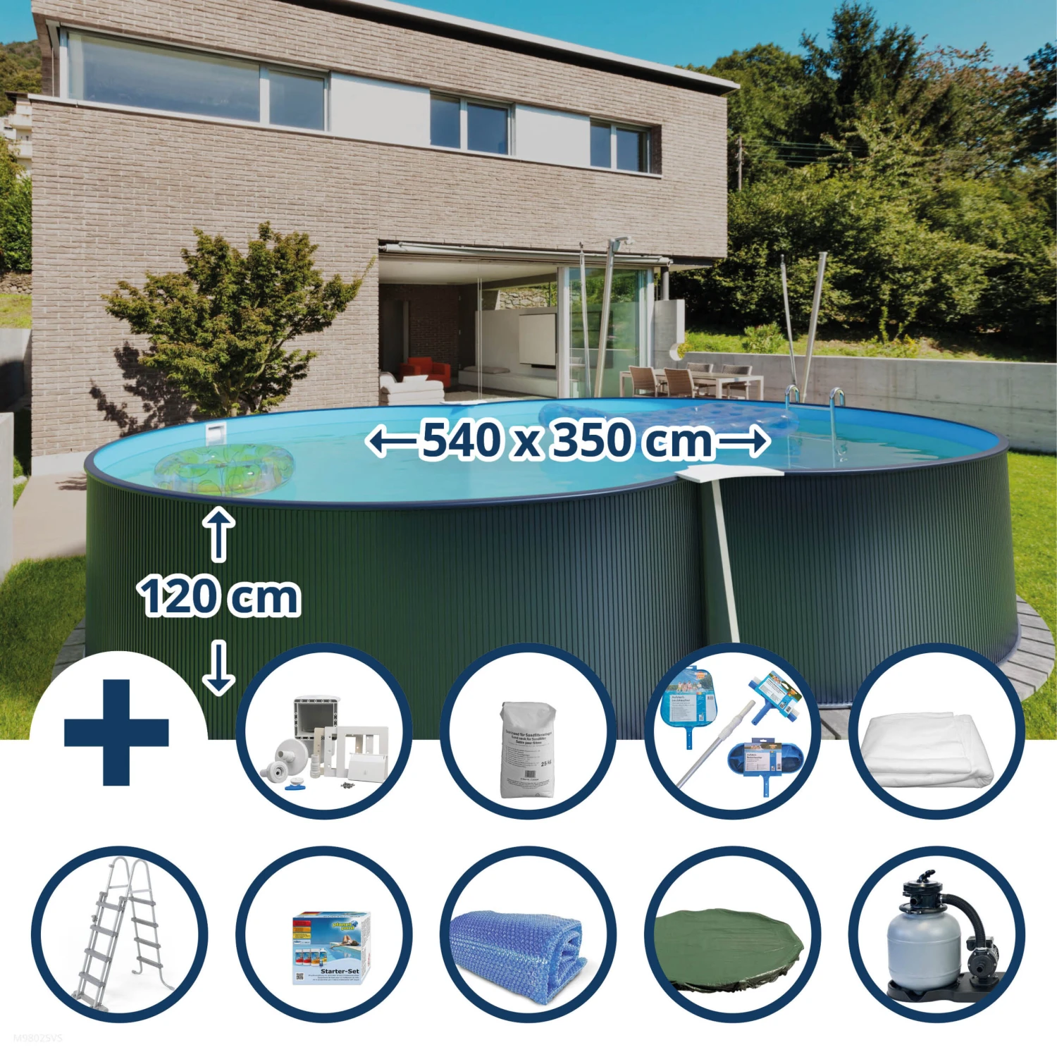 Dieser Achtformpool hat die Maße 540 x 350 x 120 cm und die Außenfarbe anthrazit.