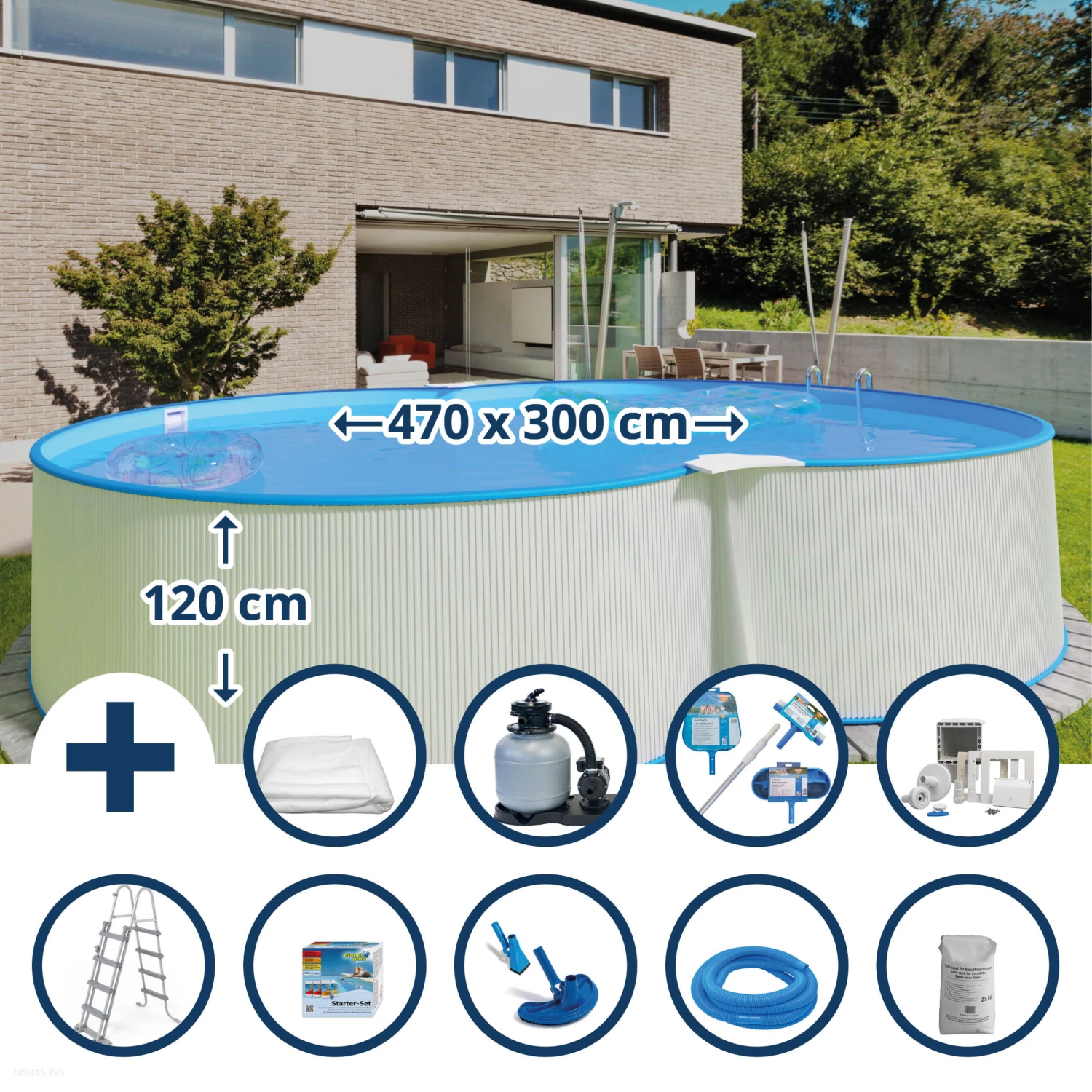 Dieser Achtformpool hat die Maße 470 x 300 x 120 cm und die Außenfarbe weiß.